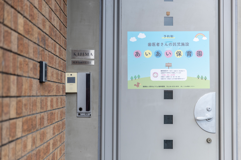 歯科受付のある入り口ではなく、あいあい保育園専用入り口でインターフォンを押し、お名前をおっしゃって下さい。